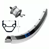 Roue avant 700 mm avec moyeu dynamo Shimano DH-3N30, jante oeilletée Exal ZX 19 mm à double paroi, 36 rayons inox 2 mm, montage sur le vélo par attache rapide.